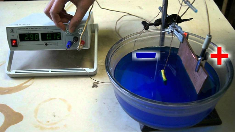 - После этого промываем детали в воде и погружаются с помощью фиксатора в ванну с электролитом. Обычно подвес выполняют из медной проволоки, на которую и вешают деталь. К этой проволоке присоединяется зажим минус от выпрямителя. Рядом на емкости с помощью медной проволоки крепим свинцовый анод, к которому подают плюс от питания.