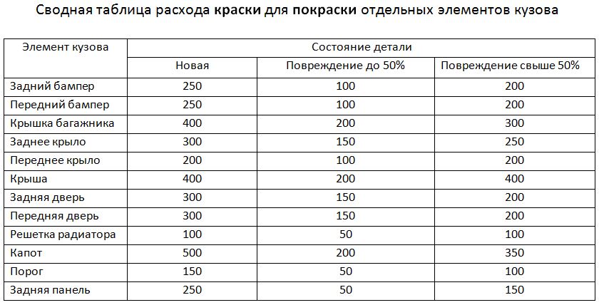 Вот вам для примера таблица, которая поможет сориентироваться по объему краски, необходимому для разных элементов конструкции кузова.