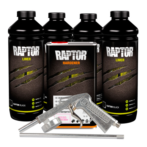 Поставляется данный материал готовым набором, в который входит 4 емкости по 750 грамм с самой краской и 1 л с отвердителем, с которым она размешивается. В комплектацию также включен специальный пистолет (краскопульт) для покраски раптором, который уже настроен на работу с этим материалом.