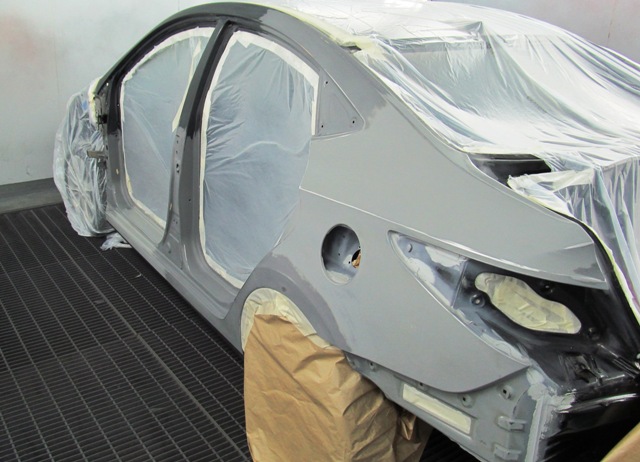 Проводится зачистка кузова от сколов ЛКП, ржавчины и прочих дефектов. Делают это обычно механическим путем с применением шлифовальной машинки и различного размера абразивов. Если на поверхности есть места с чистым металлом, то желательно дополнительно их обработать грунтом ACID #8. Вмятины и повреждения рихтуют и шпаклюют выравнивания плоскость поверхности. Далее вся область покраски обезжиривается с помощью Уайт-спирит, или антисиликона.