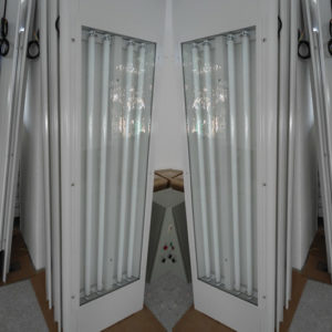 - По 3 лампы устанавливаем на боковых стенках. При горизонтальном монтаже расстояние между ними 1,5 метра, а при вертикальном, 1 лампу ставим в центре, а 2-е по бокам от нее на расстоянии 2-х метров.
